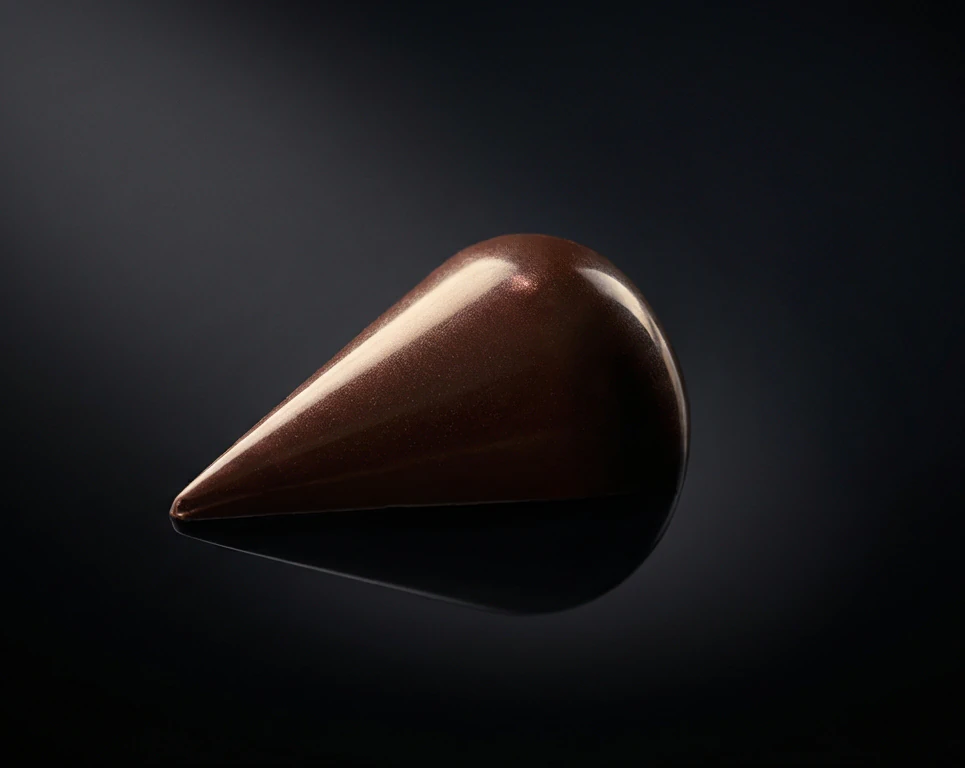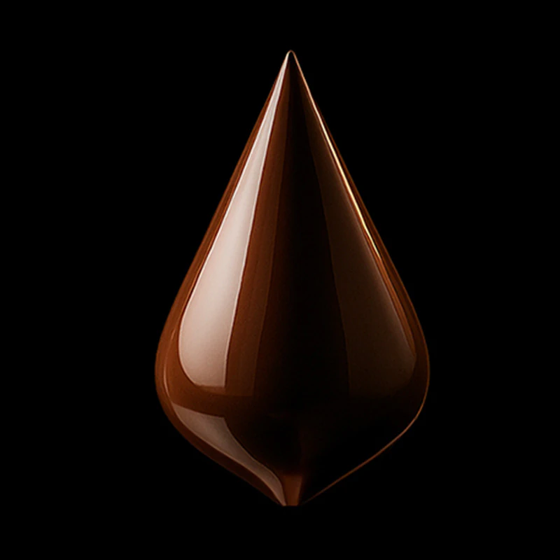 I recognized it immediately — the form that would become the silhouette of our chocolates: a suspended tear, pure and stretched downward, like a moment extended in time.